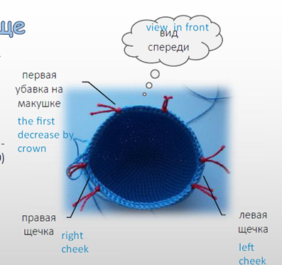 (30) knit, after connecting the torso and face with each other: 13 sbn; {we form the top of the head: ub; 7 sbn; ub}; 11 sbn; {we form the left cheek: ub; 2 sc; ub}; 20 PRS; {we form the right cheek: ub; 2 sc; ub}; sbn; ss.
