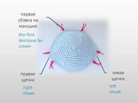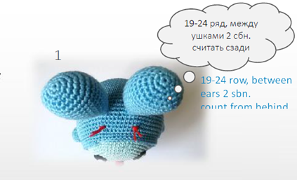 Sew to the body (decreases outward) between 19 and 24 rows, focusing on markers 1 and 2 (see photo l.9). Between the ears 2 sbn