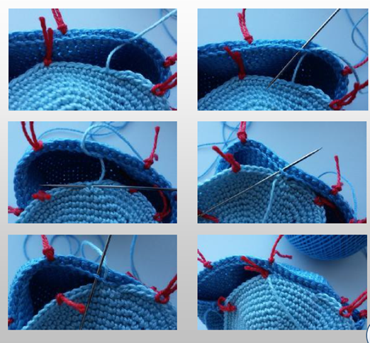 Finish knitting, fasten the thread, leaving a rather long a tail for connecting parts.