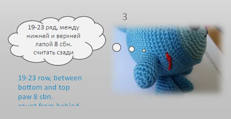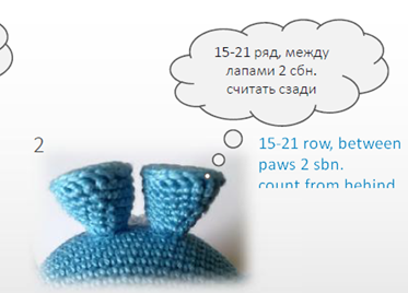 Assembly: sew to the body (decreases inward) between 19-23 rows (we count from the back). Between ear and foot 19 sbn.
