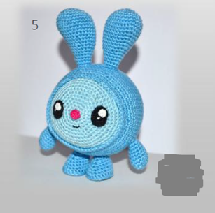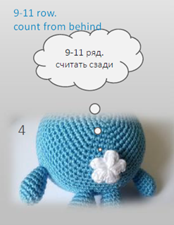 Assembly: sew to the body between 15 and 21 rows (counting leading from the back). Maintain a gap of 2 between the legs sbn.